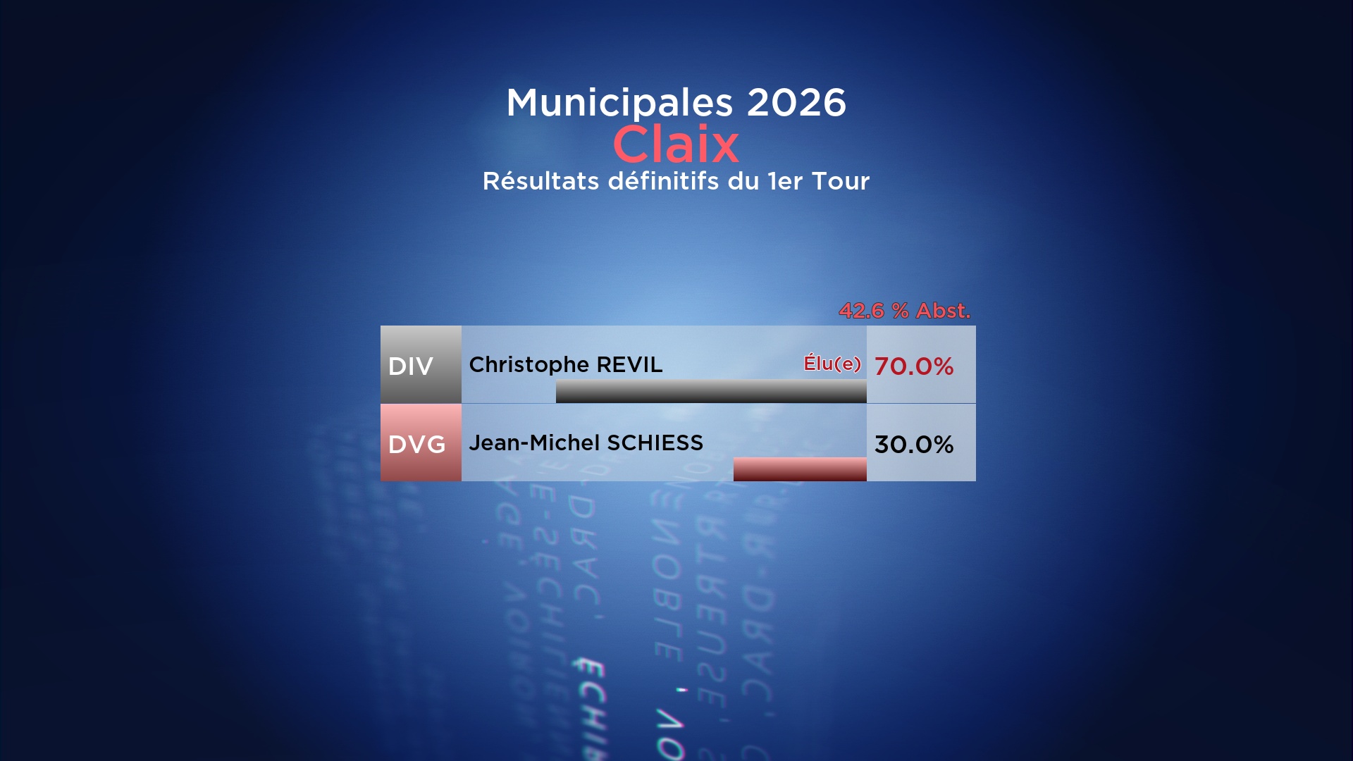 Résultats définitifs : la liste AUX COTÉS DES CLAIXOIS menée par Christophe REVIL (DIV) l’emporte avec 70.00% face à la liste Ensemble pour Claix de Jean-Michel SCHIESS (DVG) qui obtient 30.00%.