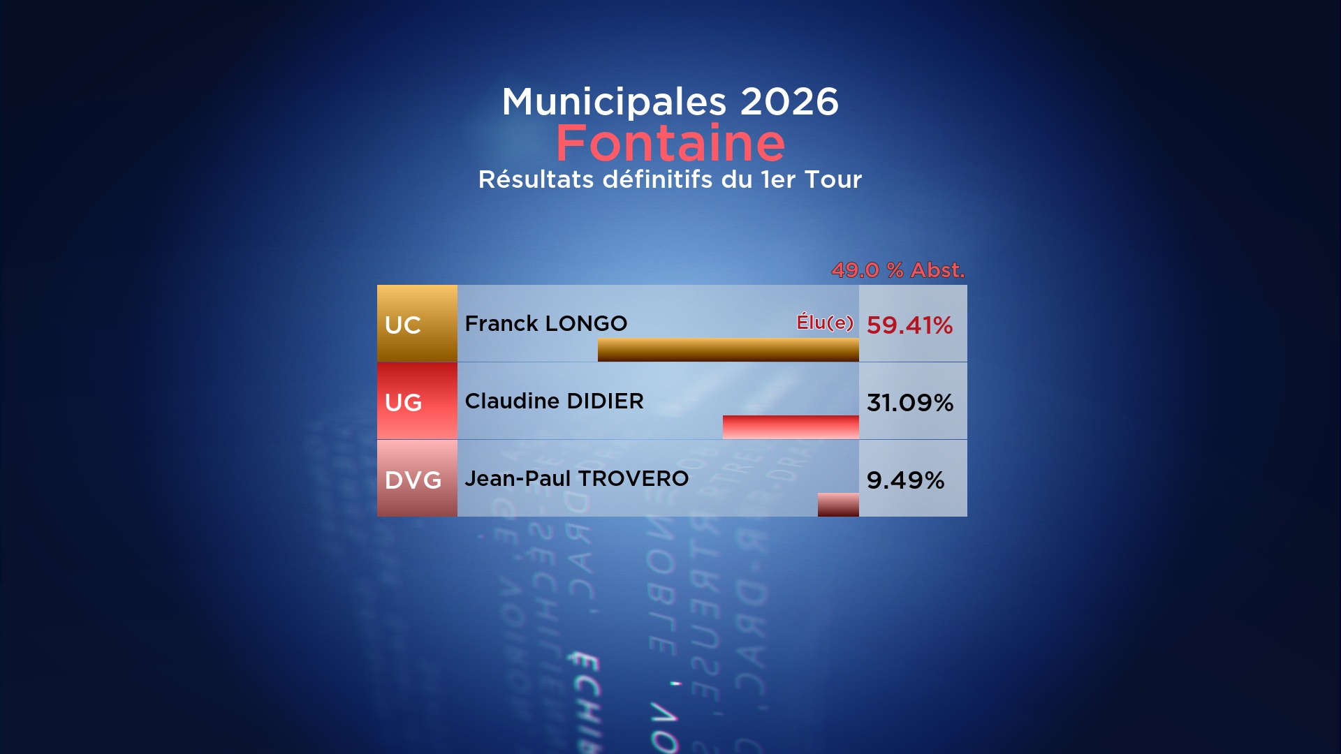 Résultats définitifs : la liste Ensemble pour Fontaine avec Franck LONGO menée par Franck LONGO (UC) est élue dès le 1er Tour avec 59.41%.