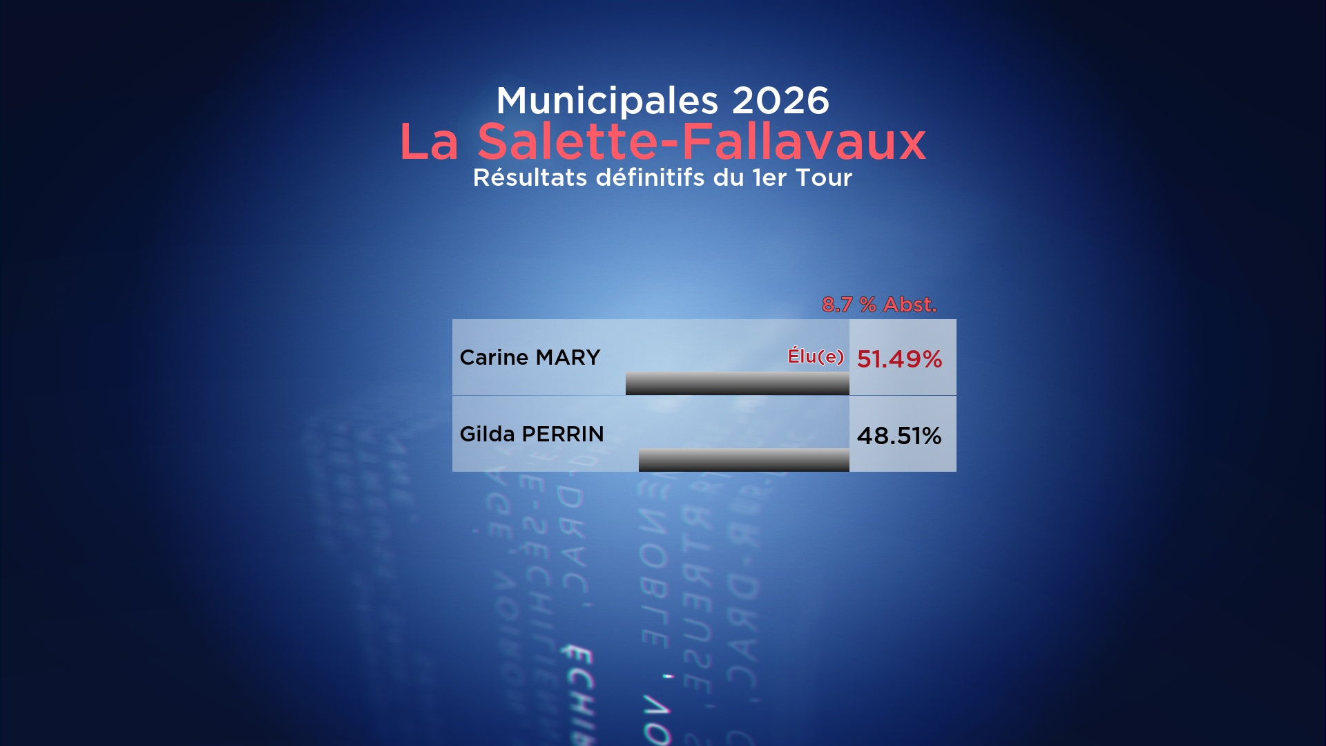 Résultats définitifs : la liste UNE EQUIPE DYNAMIQUE POUR L'AVENIR DE LA SALETTE menée par Carine MARY l’emporte avec 51.49% face à la liste ENSEMBLE POUR LA SALETTE de Gilda PERRIN qui obtient 48.51%.