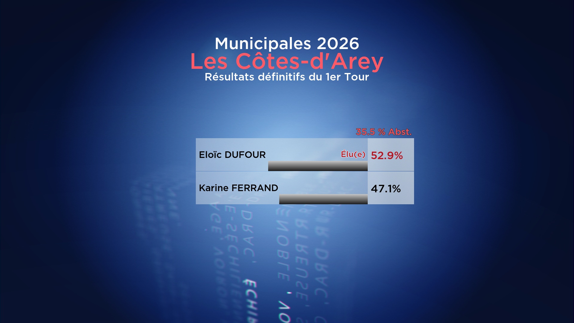 Résultats définitifs : la liste Ensemble pour l'avenir de notre village menée par Eloïc DUFOUR l’emporte avec 52.90% face à la liste Demain aux Côtes-d'Arey de Karine FERRAND qui obtient 47.10%.