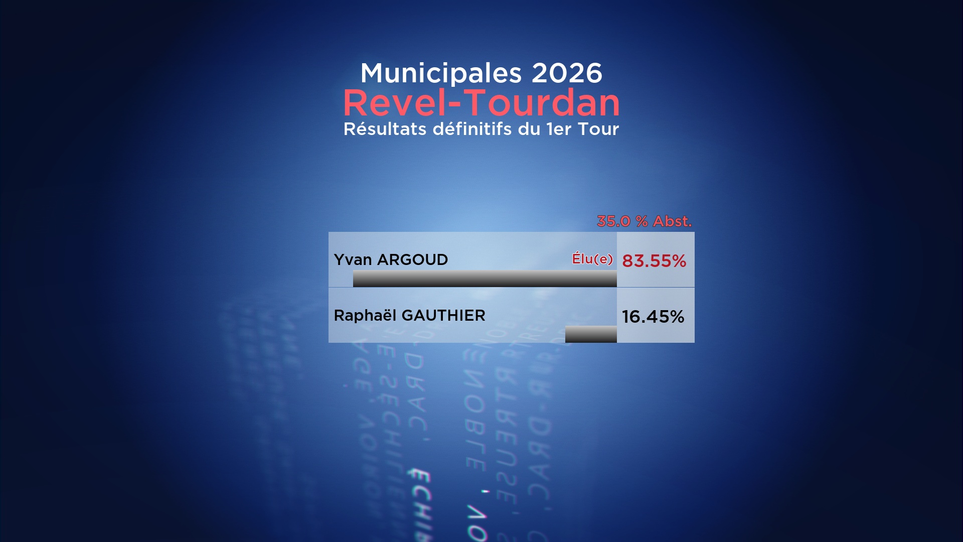 Résultats définitifs : la liste Avançons pour Revel-Tourdan menée par Yvan ARGOUD l’emporte avec 83.55% face à la liste Tourvellois(e), Relève-toi de Raphaël GAUTHIER qui obtient 16.45%.