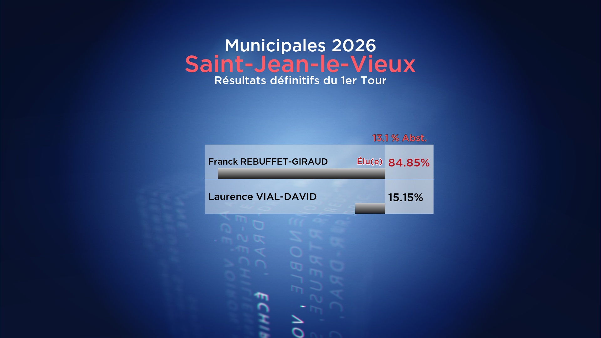 Résultats définitifs : la liste SAINT-JEAN-LE-VIEUX, UN VILLAGE VIVANT menée par Franck REBUFFET-GIRAUD l’emporte avec 84.85% face à la liste Saint Jean Le Vieux Demain de Laurence VIAL-DAVID qui obtient 15.15%.