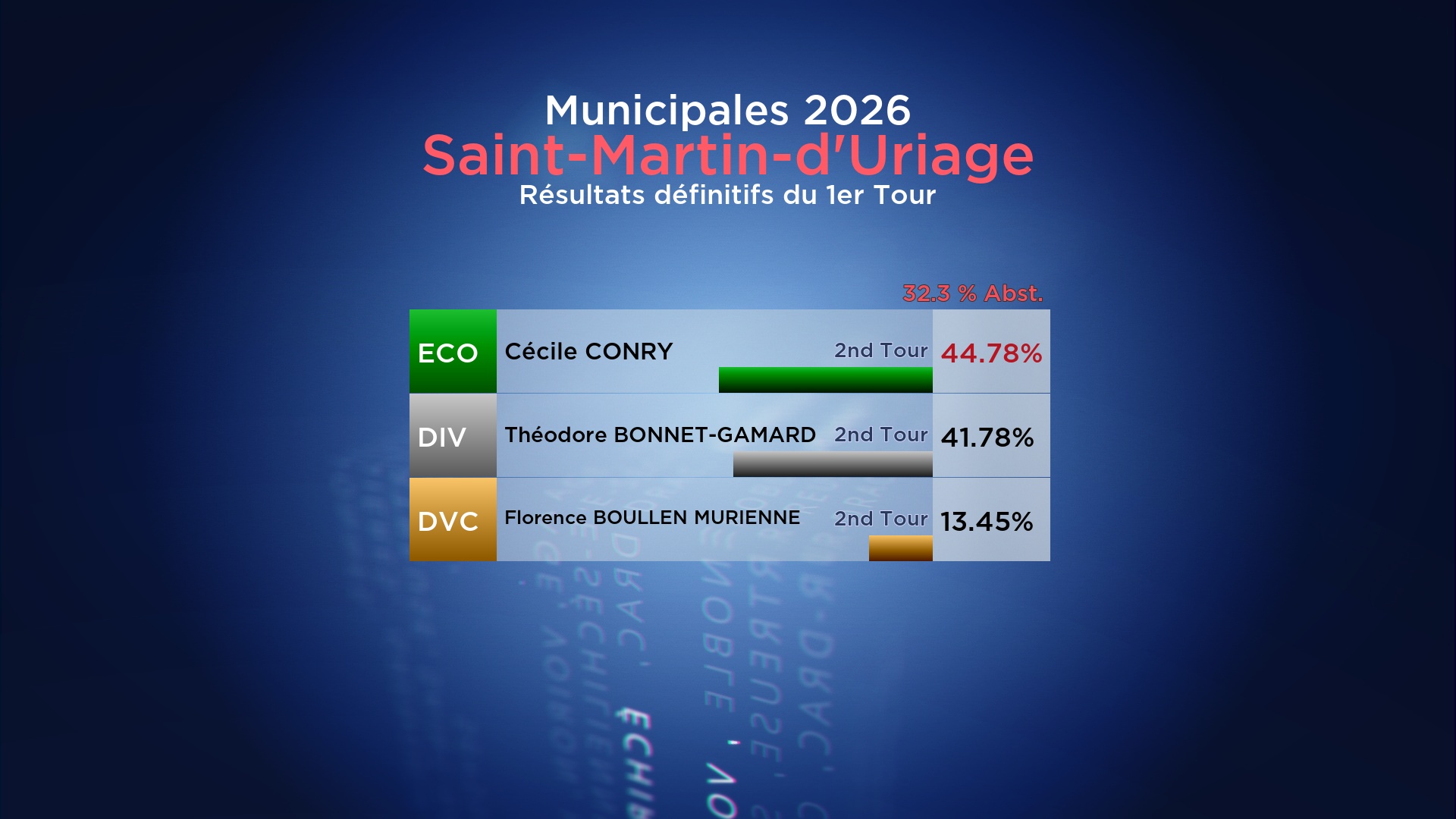 Résultats définitifs : la liste Saint Martin d'Uriage, renforçons nos liens pour bâtir une commune solidaire et durable menée par Cécile CONRY (ECO) est en tête avec 44.78%.