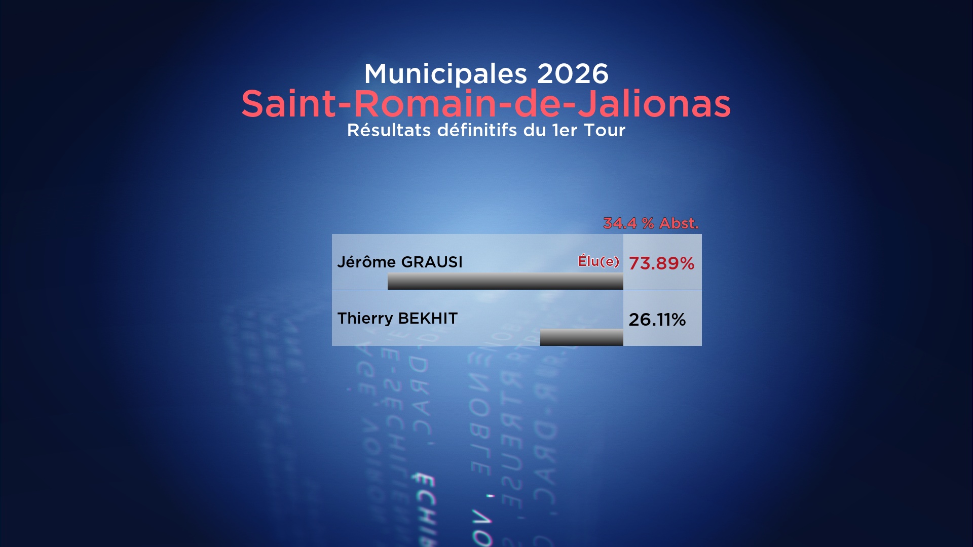 Résultats définitifs : la liste S'Unir Pour Agir à Saint Romain de Jalionas menée par Jérôme GRAUSI l’emporte avec 73.89% face à la liste Ensemble à Saint Romain de Jalionas de Thierry BEKHIT qui obtient 26.11%.