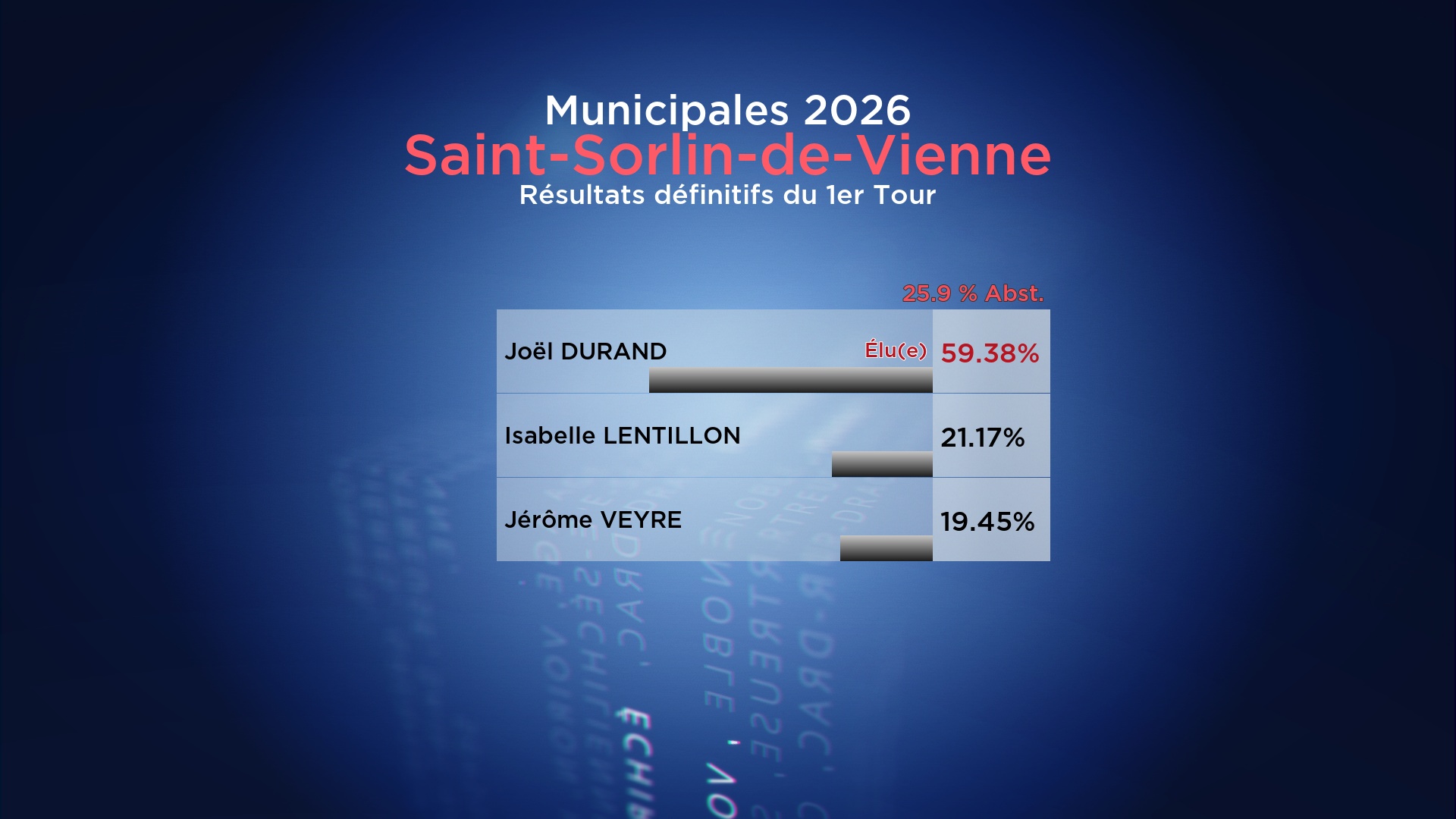 Résultats définitifs : la liste Un Nouvel Élan pour Saint Sorlin de Vienne menée par Joël DURAND est élue dès le 1er Tour avec 59.38%.