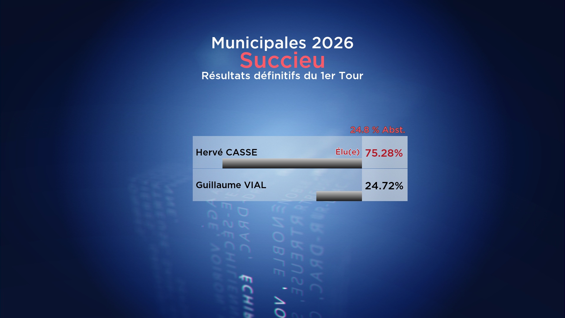 Résultats définitifs : la liste Succieu : Construisons notre avenir en commun menée par Hervé CASSE l’emporte avec 75.28% face à la liste Succieu, Agir ensemble naturellement de Guillaume VIAL qui obtient 24.72%.