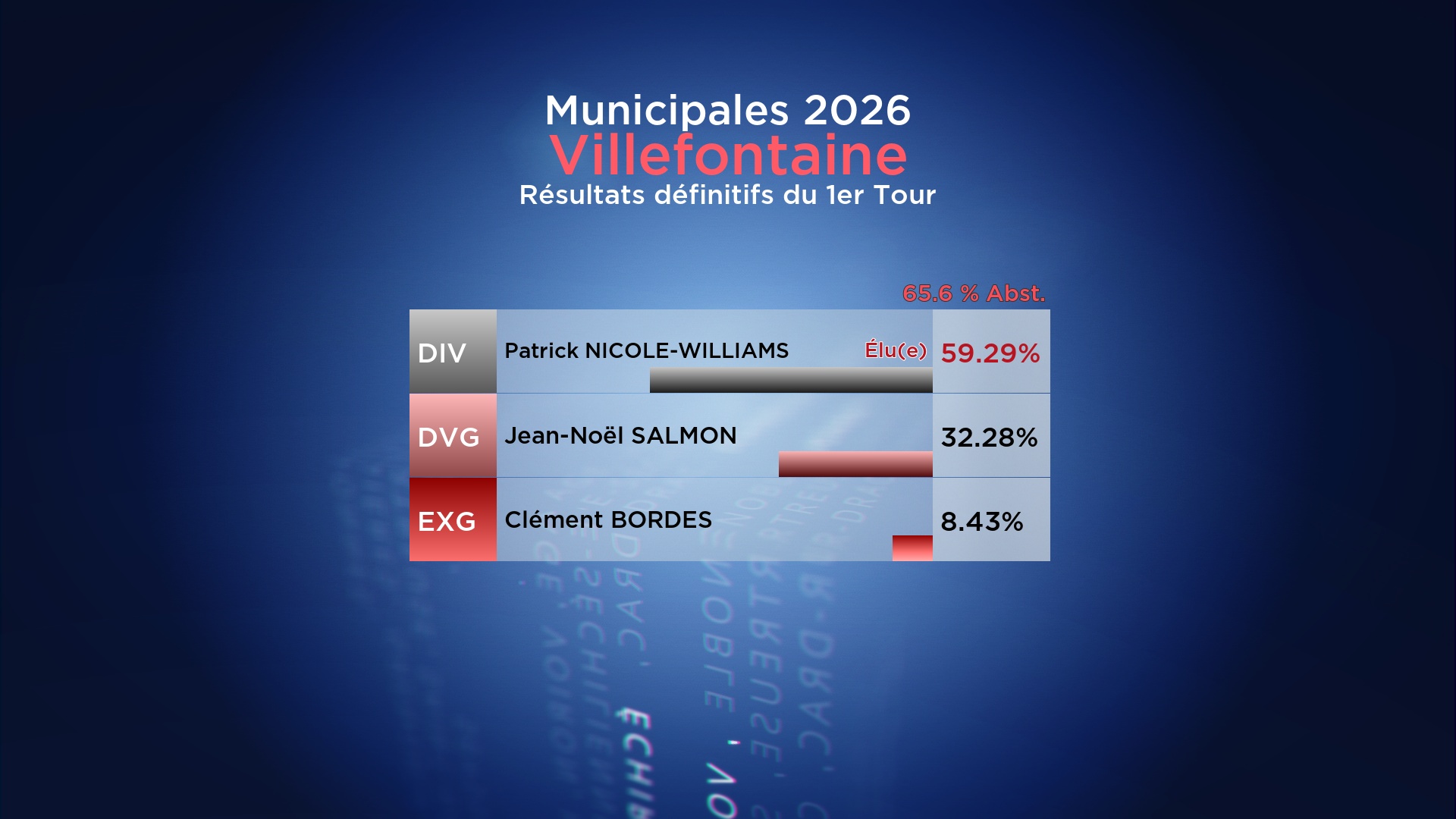 Résultats définitifs : la liste Bien Vivre à Villefontaine menée par Patrick NICOLE-WILLIAMS (DIV) est élue dès le 1er Tour avec 59.29%.