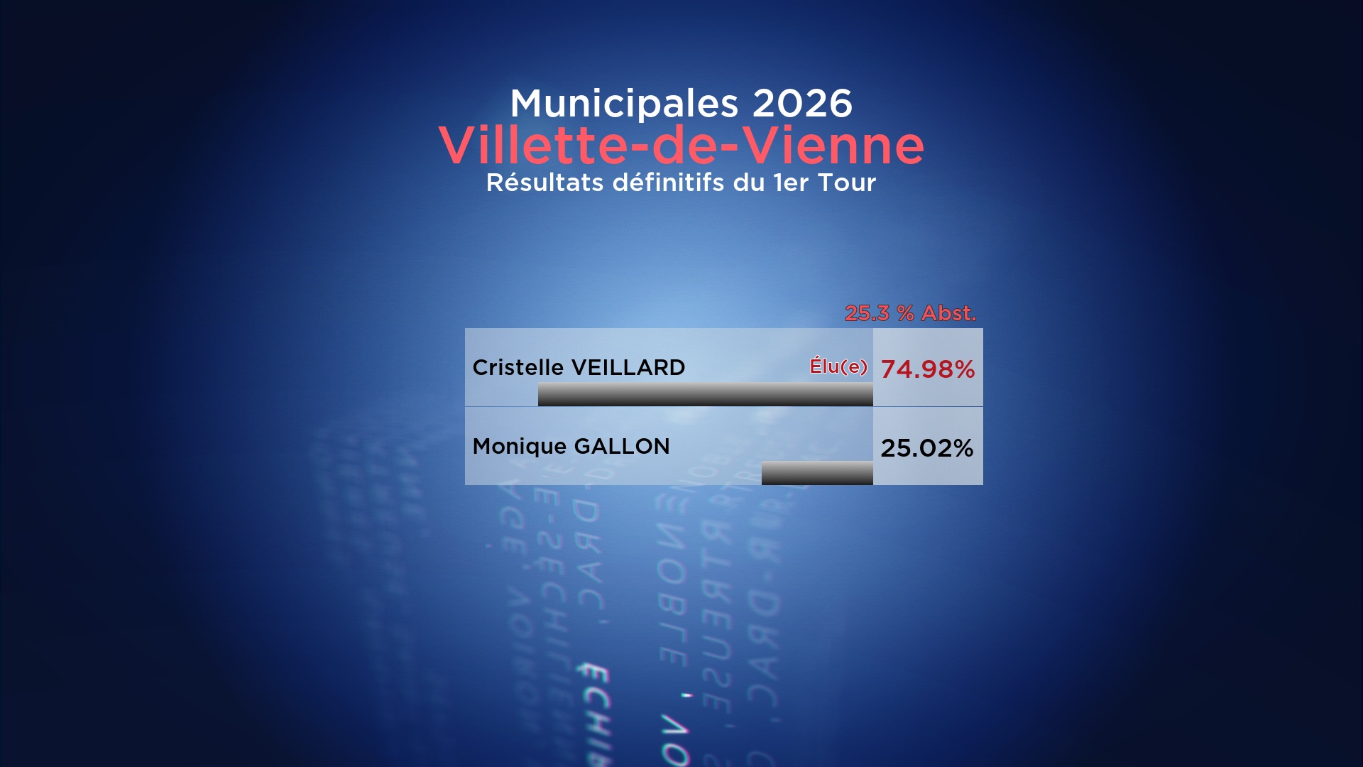 Résultats définitifs : la liste Continuons d'agir ensemble menée par Cristelle VEILLARD l’emporte avec 74.98% face à la liste Horizon 2026 Villette de Vienne de Monique GALLON qui obtient 25.02%.