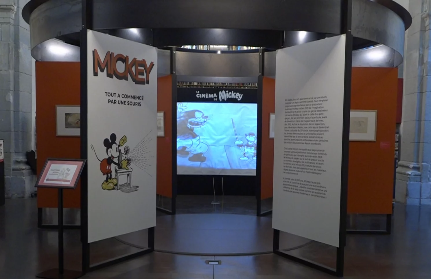 Mickey est créé en 1928 par Walt Disney, avec le dessinateur Ub Iwerks. Et Minnie voit le jour la même année. Près de 180 pièces, sont exposées au couvent Sainte-Cécile. Ces œuvres ont été rassemblées grâce au travail des deux commissaires d’exposition, Bruno Girveau et Pierre Lambert, qui ont sollicité des collectionneurs particuliers passionnés par l’univers de Mickey, mais aussi des objets d’art provenant du musée des arts décoratifs Paris, la cité internationale de la bande dessinée et de l’image, etc.