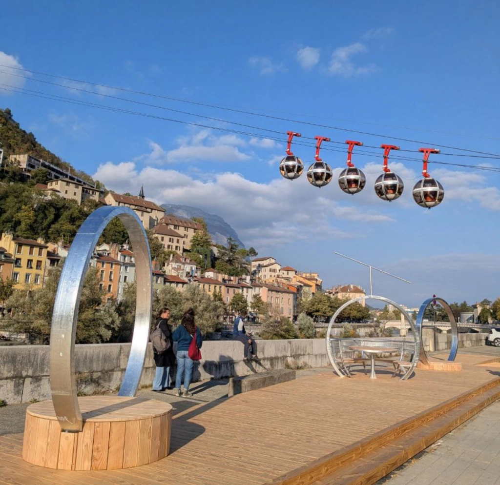 L’idée du projet n’est pas une simple terrasse : la Ville veut en faire un lieu de pause et de rencontre au bord de l’Isère, pensé pour tous. Le platelage en bois s’accompagne d’un mobilier urbain ergonomique, inspiré directement des bulles.