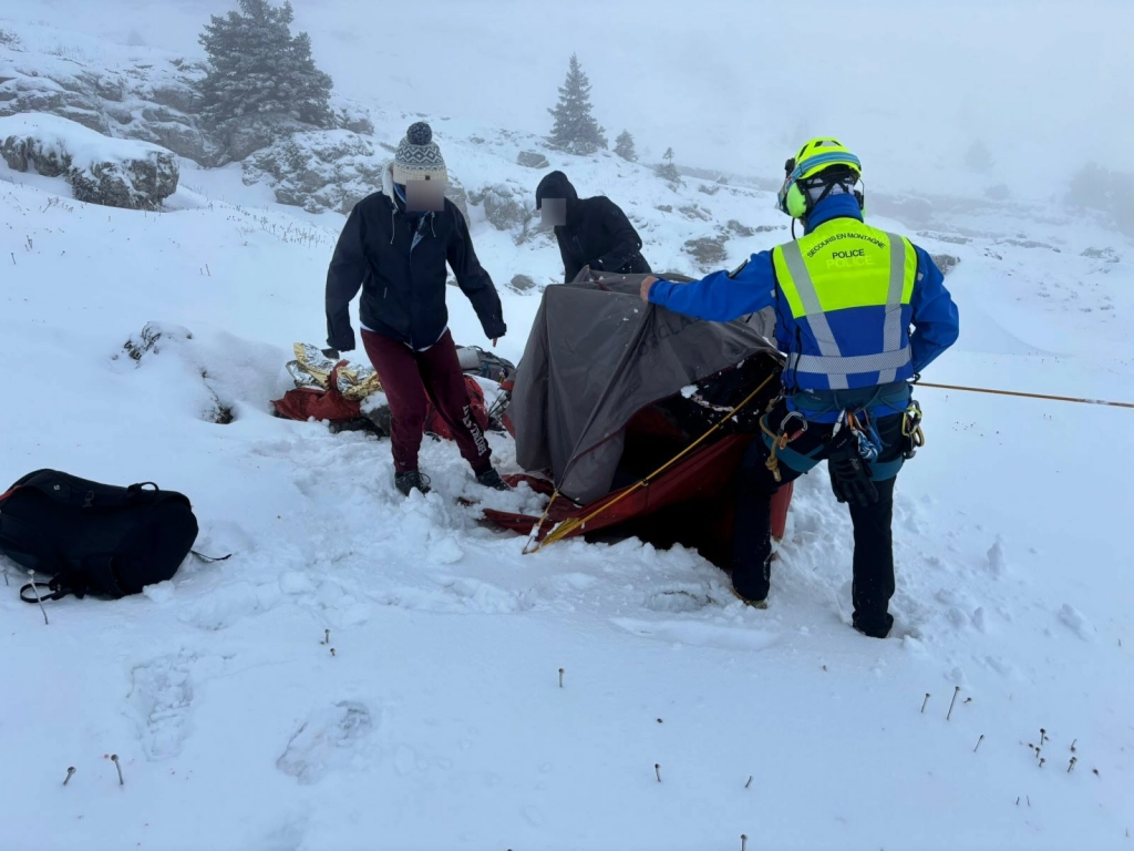 Dans la nuit de samedi à dimanche, les chutes de neige se sont intensifiées, rendant toute descente impossible par le raide pas de l’Œille. Au petit matin, les deux randonneuses, frigorifiées et désorientées, ont contacté les secours. Un hélicoptère de la Sécurité civile a réussi à déposer une équipe de secouristes sous la couche nuageuse. Ils ont aidé les jeunes femmes à démonter leur tente avant de les évacuer dans la vallée.