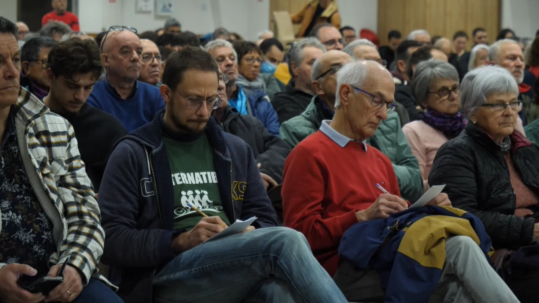 Jérémy, à gauche, membre d’Alternatiba, prenant des notes.