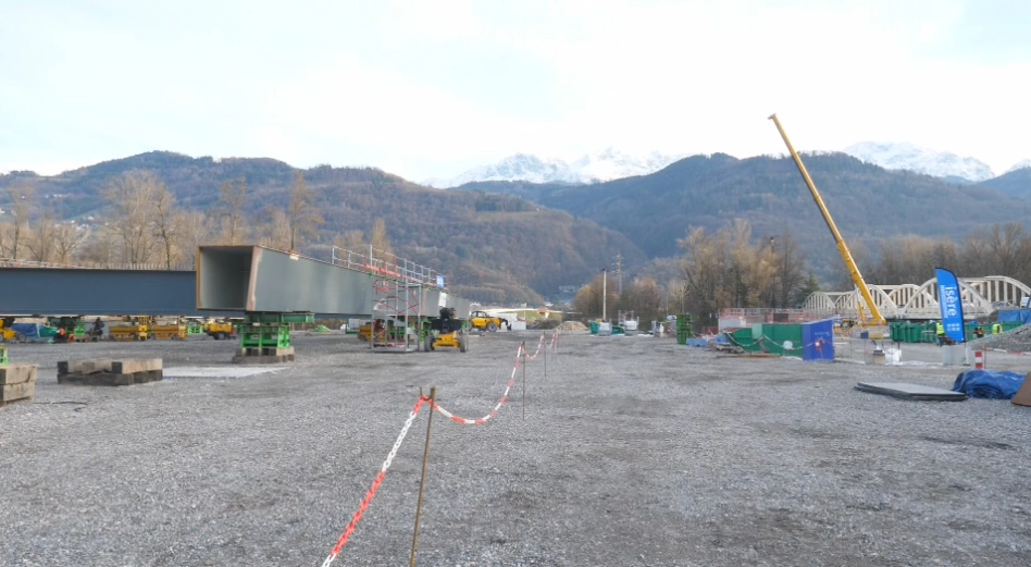 La fabrication des éléments métalliques s’est déroulée sur trois sites en France, avant leur transfert en Isère par convois exceptionnels. Sur place, l’assemblage progresse à un rythme soutenu. « Ici, on est sur la partie soudage. Les dalles en béton armé, elles, sont préfabriquées en usine », détaille Milani en montrant les équipes au travail. L’intégralité de la structure sera ensuite portée et positionnée d’un bloc au-dessus de l’Isère.