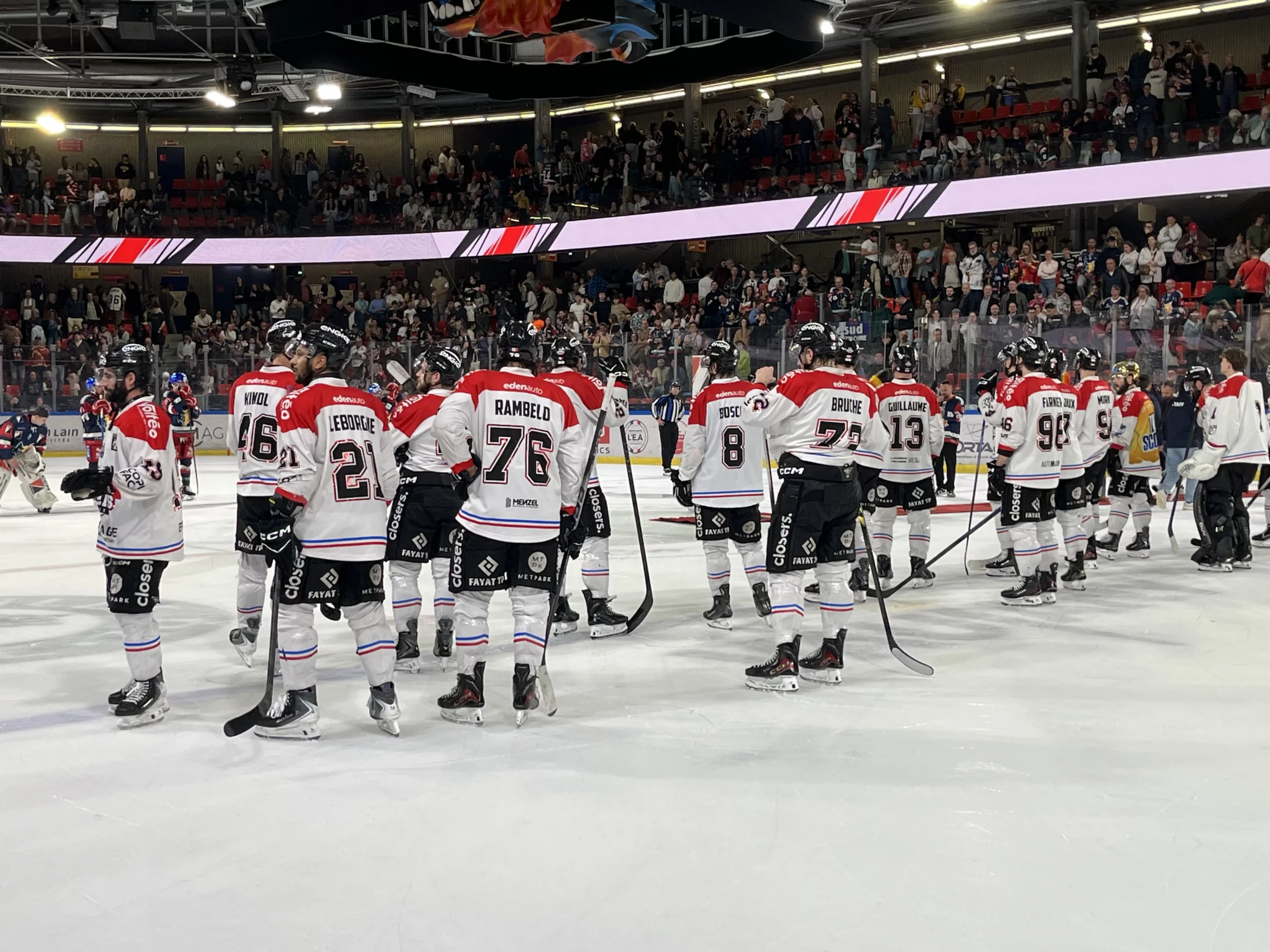 Les Brûleurs de Loups sur leur glace de Grenoble pendant un match avec du public autour