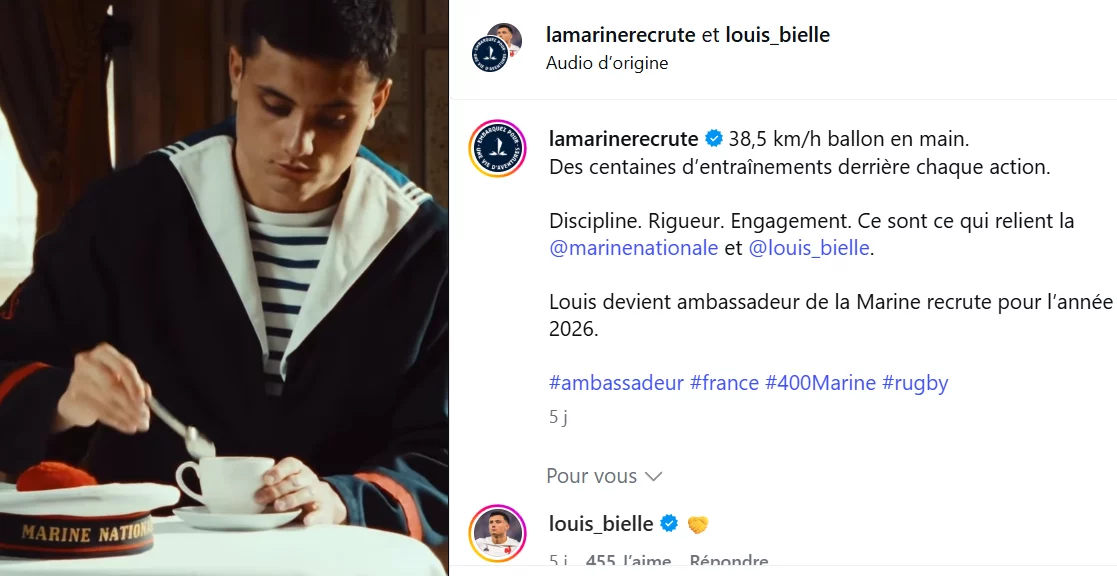Difficile de suivre le rythme de LBB. Après avoir affolé les défenses pendant le Tournoi des 6 Nations, l’ailier du XV de France, formé à Seyssins et Grenoble, ajoute une nouvelle ligne à son palmarès : ambassadeur de la Marine nationale. L’annonce a été faite sur ses réseaux sociaux, confirmant un partenariat symbolique pour les 400 ans de l’institution. « La Marine recrute décolle, elle a un nouvel ambassadeur », a salué le chef d’état-major, voyant en lui « le meilleur profil pour incarner les 80 métiers » du secteur. Si les terrains de rugby restent son terrain de jeu principal, le joueur de l’Union Bordeaux Bègles endosse désormais un rôle plus institutionnel. Discipline, rigueur, engagement : des valeurs qu’il partage volontiers avec la Marine. « Ce sont ce qui relient la Marine nationale et Louis Bielle-Biarrey », résume encore l’annonce.