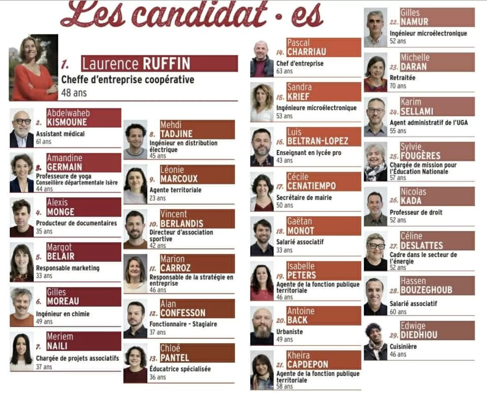 On ne retrouve d’ailleurs qu’un quart environ de l’ancienne équipe (12 personnes) dont les « historiques » Olivier Bertrand, Alan Confesson, Antoine Back et Kheira Capdepon qui postulent pour un troisième mandat. Margot Belair qui avait postulé, elle, pour être tête de liste, se retrouve en cinquième position. Lucille Lheureux qui était également candidate à cette primaire est, sans surprise, sortie du jeu. L’adjointe à la culture avait envenimé le scrutin interne aux écologistes en septembre dernier en reprochant à Eric Piolle des tentatives d’intimidation pour qu’elle se désiste au profit de Laurence Ruffin.