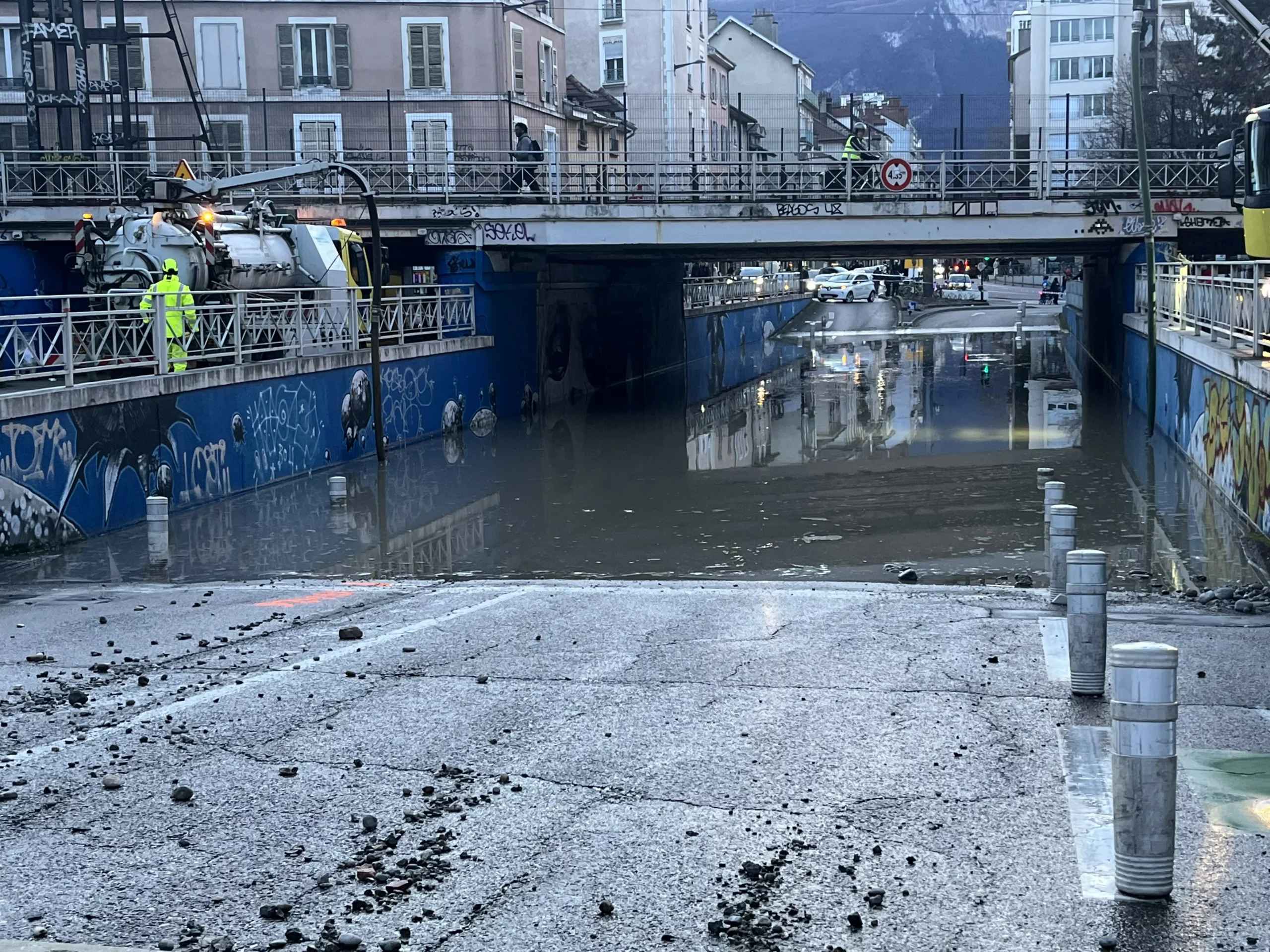 La canalisation s’est rompue au niveau du 70 cours Berriat, provoquant d’importants dégâts sur la chaussée au passage sous le pont du chemin de fer. Les services de Grenoble-Alpes Métropole ont rapidement coupé l’alimentation en eau pour stopper l’inondation, mais près de 1 500 mètres cubes d’eau avaient déjà envahi la voirie. Les causes de cette rupture restent à déterminer. EDF, les agents de la régie des eaux de Grenoble et les services métropolitains sont mobilisés sur place depuis le début de l’après-midi.