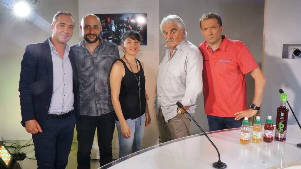 Avec Serge Papagalli, humoriste, comédien et… chanteur ; Adrien Mollard président de la société Antésite-Noirot et le groupe Picky Banshees, avec Samuel Chaffange et Cindy Ladakis.