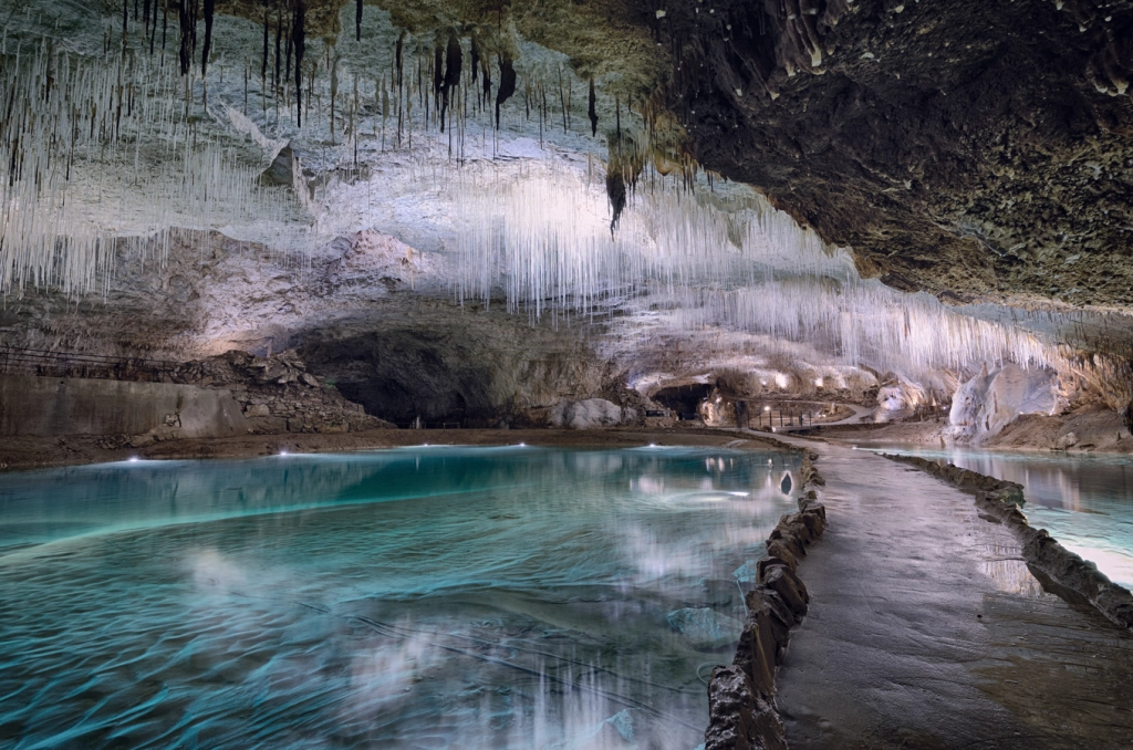 Ici, pas de galerie sombre ou oppressante. Ce sont des cavités aux volumes généreux, traversées de rivières souterraines et éclairées avec justesse, qui révèlent l’extraordinaire finesse des stalactites fistuleuses : de véritables tubes de calcite, parfois longs de plus d’un mètre, suspendus comme une chevelure minérale au-dessus de l’eau turquoise.