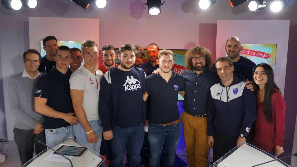 Les Espoirs du FCG sur un plateau avec les coentraineurs Sylvain Begon et Lionel Enselmoz – David Dussert, directeur de la formation – Paulin Mas, talonneur – Gaëtan Houdiarne , le capitaine !