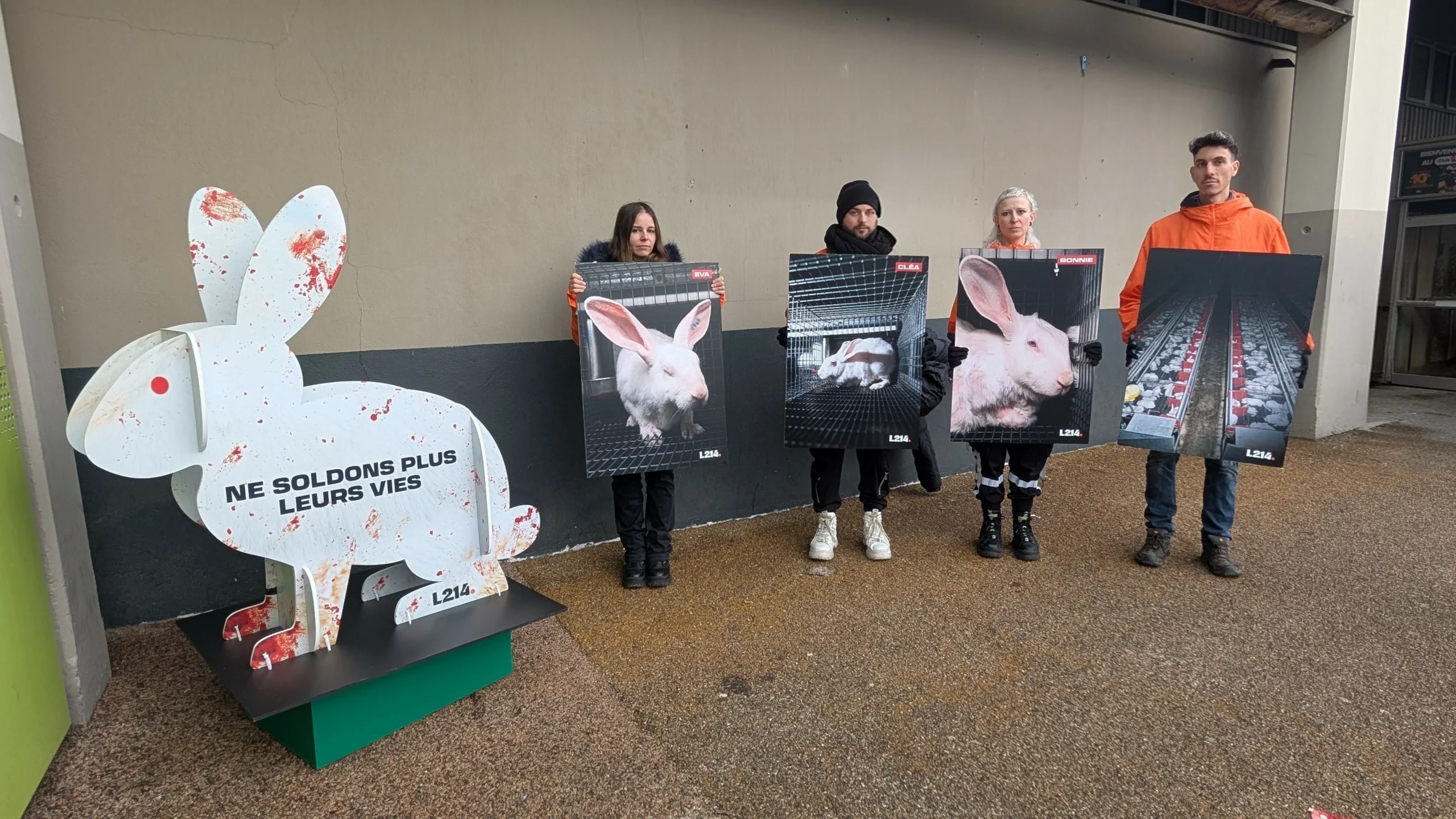 Samedi après-midi, les clients du Carrefour de Meylan ont été accueillis par une scène inhabituelle. Devant l’entrée du magasin, une dizaine de militants de L214 ont déployé banderoles et tracts, accompagnés d’un lapin géant ensanglanté en carton, symbole de leur campagne nationale. Les visuels montraient notamment des portraits de lapines reproductrices, accompagnés du slogan“Ne soldons plus leurs vies”.
