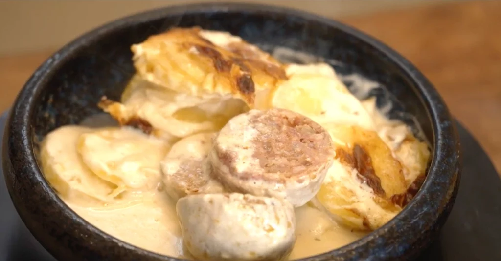 5 – Déposer les pommes de terre cuites dans le plat. Ajouter 15 cl de crème et mettre au four à 155°C pendant 1 heure et 40 minutes.