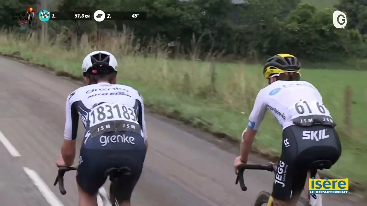 Gustave BLANC (Auvergne-Rhône-Alpes) et Roberto CAPELLO (Team Grenke Auto Eder) s’extirpent alors dans le Mont Tournier (10,3km à 5,5%), première grosse difficulté du jour, et basculent avec une trentaine de secondes d’avance. Idem au sommet du Col de la Crusille, quelques kilomètres plus loin, avec 45 secondes cette fois.